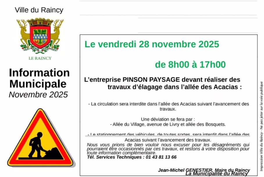 • La circulation sera interdite dans l’allée des Acacias suivant l’avancement des travaux.