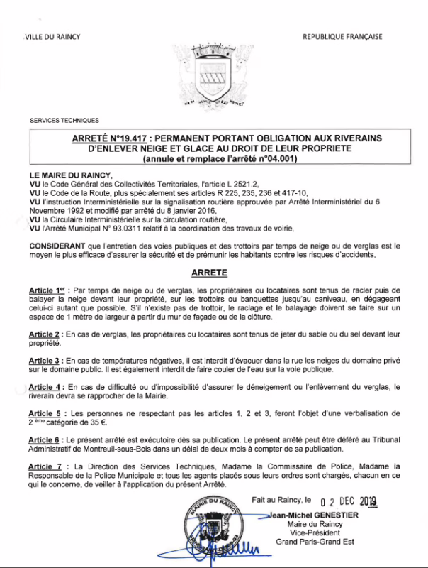 Il est rappelé que chaque riverain est tenu de déblayer la neige et de saler le trottoir devant son lieu d’habitation, conformément aux dispositions de l’arrêté municipal n°19.417 du 2 décembre 2019 (ci-dessous).