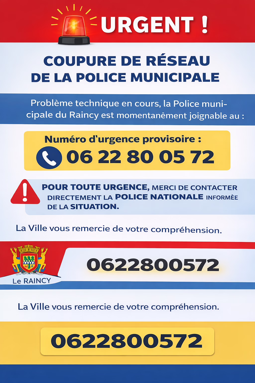 La Police municipale du Raincy rencontre actuellement une rupture de réseau impactant ses lignes téléphoniques habituelles.