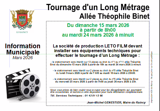 Un tournage de long métrage aura lieu allée Théophile Binet au Raincy du dimanche 15 mars 2026 à partir de 8h00 jusqu’au mardi 24 mars 2026 à minuit.