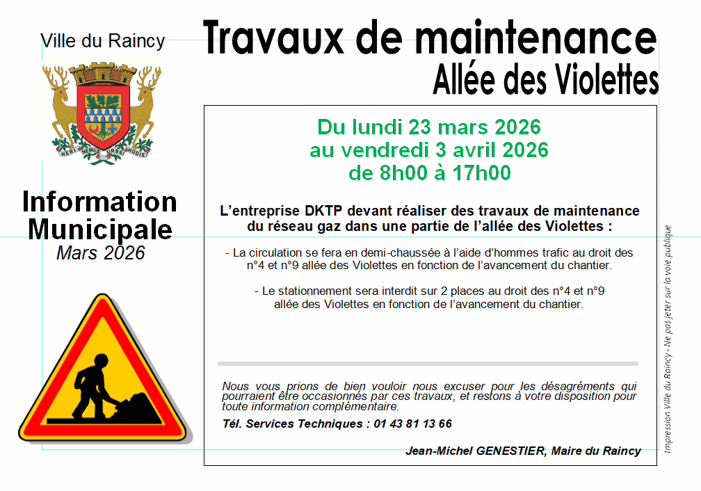 • La circulation sera maintenue en demi-chaussée, avec la présence d’hommes trafic, au niveau des n°4 et n°9 allée des Violettes, en fonction de l’avancement des travaux.