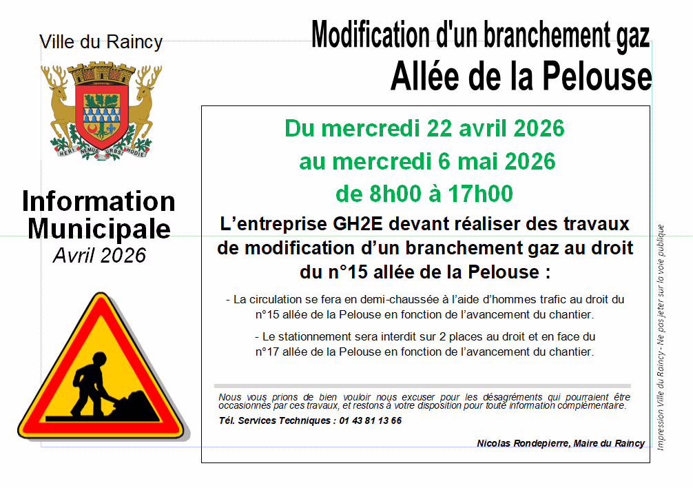 Des travaux de modification d’un branchement gaz seront réalisés par l’entreprise GH2E au niveau du n°15 allée de la Pelouse.
