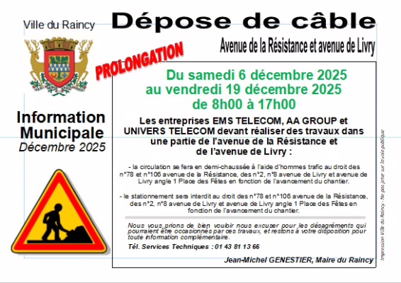 Voir toutes les infos voirieProlongation Dépose de câble – Avenue de la Résistance et avenue de Livry