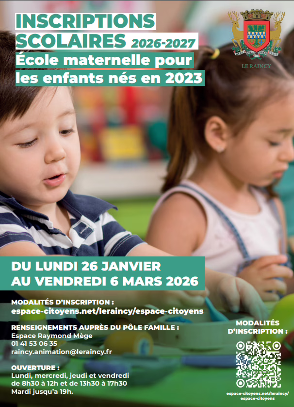 La Ville du Raincy informe les familles que les inscriptions scolaires pour la rentrée 2026-2027 sont ouvertes pour les enfants nés en 2023.
